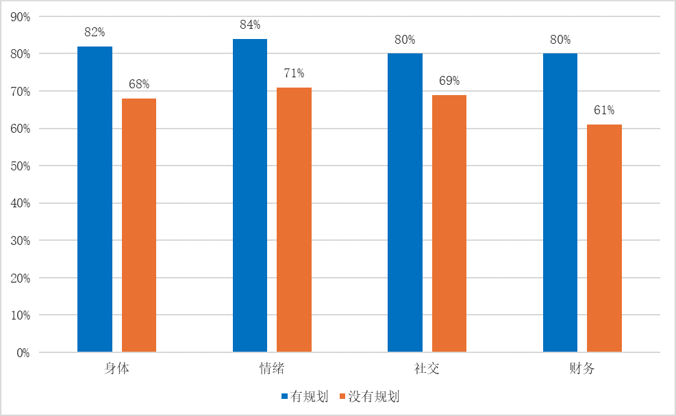 - 规划的重要性:有退休规划的人群中,有84%感到身心准备充分,而无规划人群中这一比例仅为70%