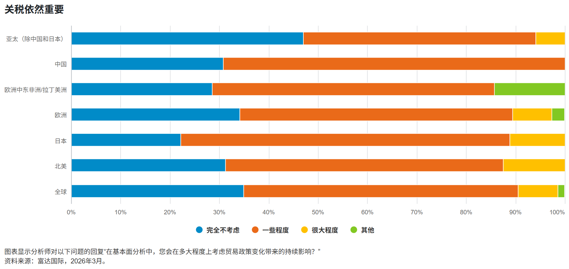 地缘政治冲击可能导致剧烈的市场波动,同时留下持久的阴影。例如,去年关税冲击后,今年调查中近三分之二的富达分析师表示,他们在基本面分析中继续考虑不断变化的贸易政策的影响。