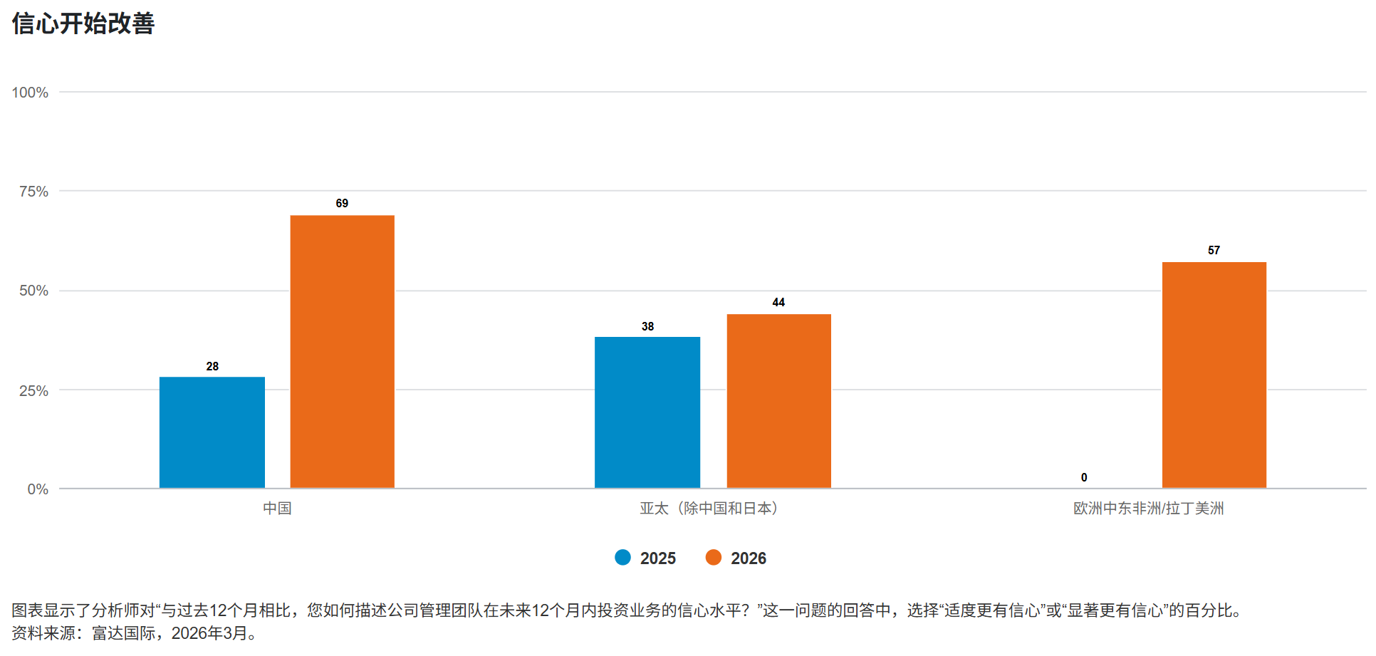 从管理层信心角度来看,新兴市场分析师对未来12个月股票表现更为自信,其中69%的中国分析师表示对未来12个月股票表现更有信心。