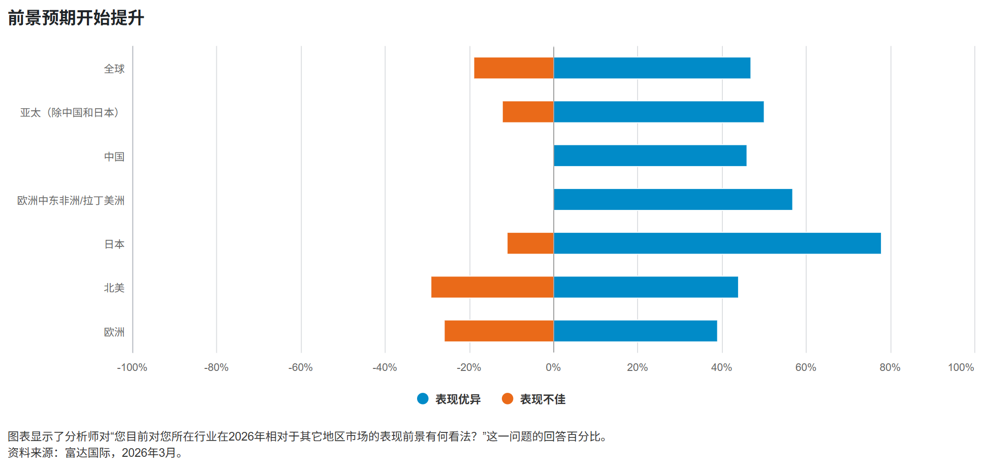从估值的角度来看,在覆盖中国企业的分析师中,31%认为他们的行业“被低估”,这一比例在全球范围内最高,而亚洲(不包括日本和中国)分析师比例为24%,EMEA/拉丁美洲分析师比例为29%。