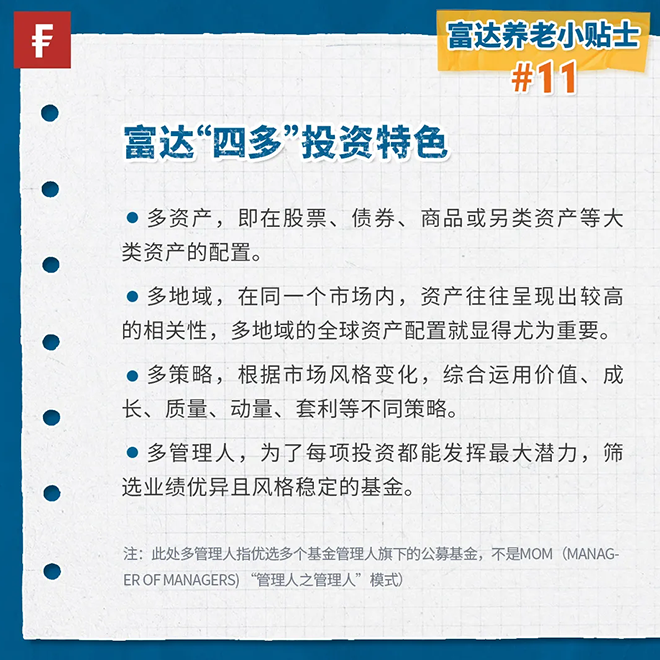 多元化的资产配置思路在养老投资中具有重要作用,尤其是在有效的风险控制方面。根据富达在全球积累的养老投资经验,我们认为有效的多元化资产配置,可以总结为“四多”:多资产、多地域、多策略、多管理人。