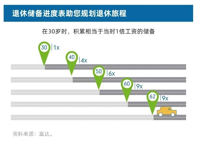富达建议在30岁时的储备目标应是当年年薪的1倍,40岁时存够4倍,50岁存够6倍,60岁存够9倍,并在62岁时维持9倍。