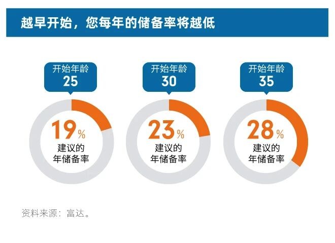 为了确保在退休后能够维持理想的生活水平,富达建议如果从25岁开始储备,每年应存下税前收入的19%。如果从30岁开始,每年则应存下23%,35岁开始则应存下28%。可见养老储备早开始,更轻松。
