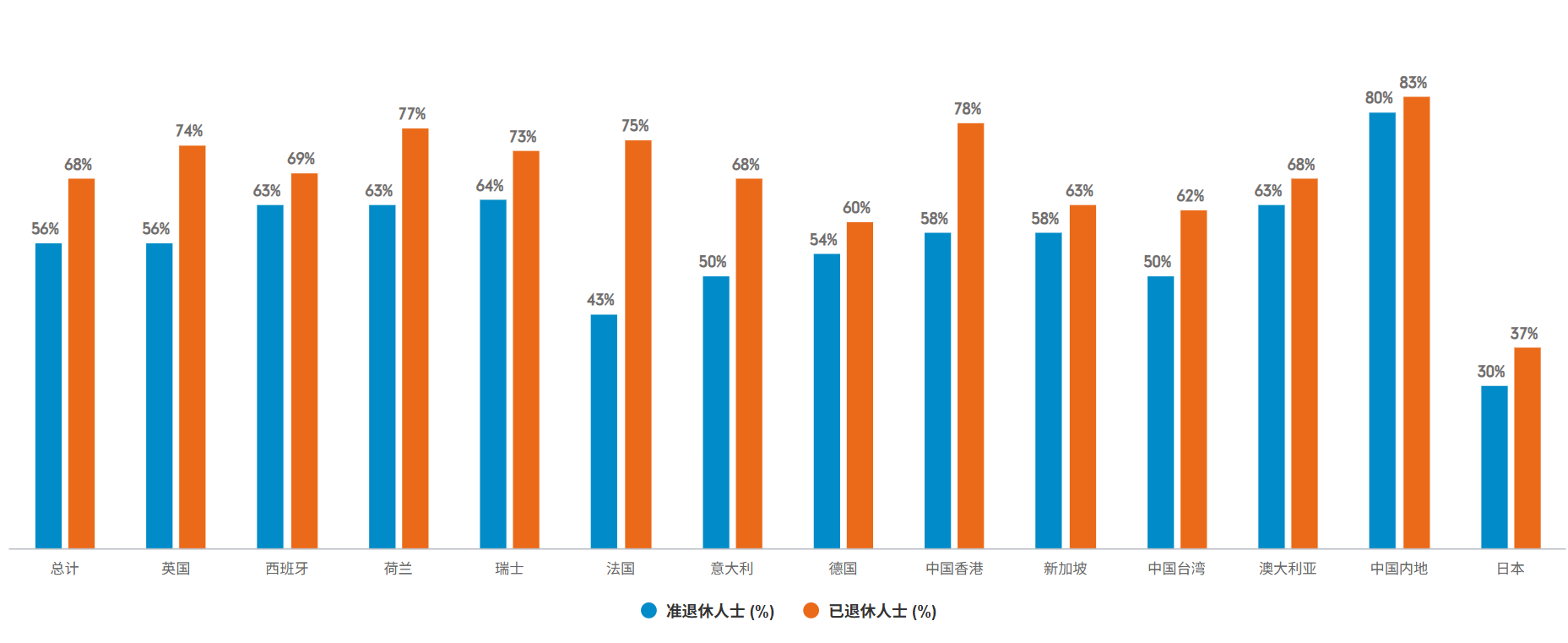 值得欣慰的是,我们的研究显示,大多数人对退休并非心怀恐惧。乐观情绪会随经历而增长:在全球范围内,56%的准退休人士与68%的已退休人士对未来生活持积极态度(见下图)。这说明,若能获得恰当的帮助,人们可以满怀信心地迎接更长的退休岁月。